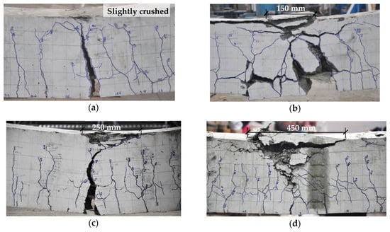 The relative reinforcement ratio ρf/ρfb of the tested specimens according to GB 50608, CSA S806, ACI 440.1R and Equation (3) are presented in Table 4. It is to be noted that the tensile strength of the LWC without steel fibers was ignored. The results indicated that specimens with ρf/ρfb close to 1 all possibly damaged by balanced failure, which could be attributed to the discreteness of material strength. In addition, the greater ρf/ρfb lent a higher degree of concrete crushing when FRP bars ruptured (Figure 7a–c). As presented in Table 4, CSA S806 provided more conservative ρf/ρfb than ACI 440.1R although the same ρfb equation was used. This could be ascribed to the higher concrete compressive strain assumed. Additionally, the proposed model provided the lowest ρf/ρfb among all the models since the contribution of the compressive reinforcements was included.