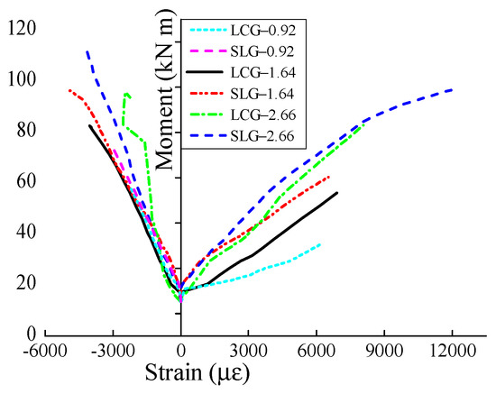 The test results are shown in Table 3, and the typical failure shapes of the specimens are depicted in Figure 7. Crushing of lightweight aggregates (LWAs) could be observed at the fractured surface in the compression zone (Figure 7b–d), owing to their low compressive strength. This was a distinctive fracture pattern of LWC beams as compared with the ordinary concrete ones. Figure 8 shows the strains in the tensile FRP bars and the compressive concrete against the applied moment of the specimens. The reinforcement strain of beam SLC–0.92 is not presented since the strain gauges were broken down. Both the moment–FRP and concrete strain responses could be divided into two segments. The first stage was a steep linear curve corresponding to the behavior before cracking, wherein the FRP bars and concrete exhibited little strain, while the second was a basically linear segment represented the post-cracking behavior. In addition, increasing the reinforcement ratio and adding steel fibers could restrain the deformation of the FRP bars, indicating their benefit achieved in flexural stiffness of the beams. Figure 8 also illustrates that the concrete strain at the maximum load level generally exceeded the assumed concrete compressive strain recommended by GB 50608.