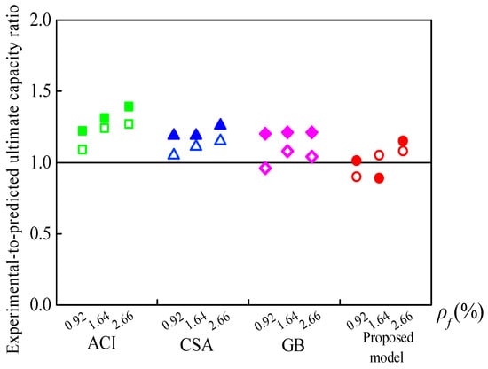Based on the actual failure mode, the experimental-to-predicted ultimate capacity ratios (Mu,Exp/Mu,Pred) of the specimens according to design codes and the proposed model are summarized in Table 4. Unfilled and filled points are used to represent the Mu,Exp/Mu,Pred of the LWC and SFLWC specimens in Figure 9, respectively. As shown in Figure 9, the estimated Mu according to the design codes were generally lower than the experimental results since the contribution of the steel fibers and the reinforcement in the compression zone was ignored.