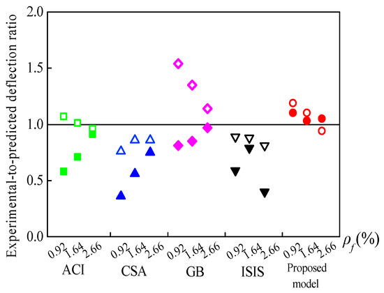 In order to evaluate the accuracy of the short-term stiffness model proposed, the measured and predicted deflections under service load levels (Ms) of FNWC beams reinforced with FRP bars tested in the literature are compared in Table 1 and Figure 4. It should be mentioned that the tensile strength of the concrete was ignored in the calculation of ρfb due to its absence in most literature. Furthermore, since the ratio between the cracking moment of the beams was considered close to that between the tensile strength of the concrete used [23], the factor (ft−F − ft)/ft in Equation (14) was replaced by (Mcr−F − Mcr)/Mcr, where Mcr−F and Mcr are the cracking moments of the FRP-reinforced beams with and without fibers, respectively.