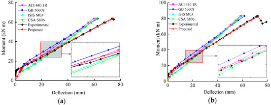 where ft is the tensile strength of concrete; M is the actual bending moment; ρte is the reinforcement ratio of the FRP bars on the basis of the effective cross-sectional area of concrete. It should be mentioned that the empirical parameters employed in Equations (7) and (8) were the same as those for steel reinforced beams.