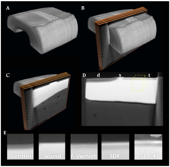 3D reconstruction of images in Amira software and the results. (A) a root dentin block specimen scanned; (B) 100 slices were then selected from the middle of each specimen and averaged to one image; (C) representative slices on the 3D image; (D) the resulting average image. The volume of interest on the treatment window is highlighted with the dotted outline. The demineralized internal control (d), sound (s) and treated (t) areas are distinctly visible; (E) representative average slices used to calculate mineral density in each group.
