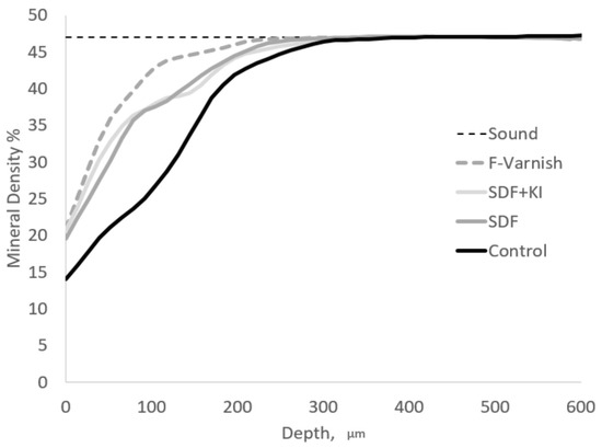 After completing data collection a representative mineral density vs. depth profile averaged over all of the specimens, is presented in Figure 2. The control group showed a typical profile of active carious lesion with no surface layer and lowest mineral densities throughout the depth. On the other hand, F-Varnish visually showed higher mineral density values compared to SDF and SDF+KI.