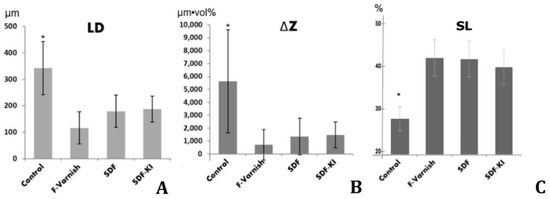Results of all groups; (A) lesion depth (LD); (B) mineral loss (ΔZ); (C) surface layer mineral density (SL). Asterisk (*) indicates significantly different group in each parameter (P < 0.05).