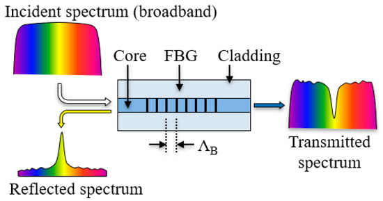In an FBG sensor, a narrow band of the incident optical field within the fiber is reflected by successive, coherent scattering from the index variations, as illustrated in Figure 2. The strongest interaction, or mode coupling, occurs at the Bragg wavelength [21], as described by Equation (2):