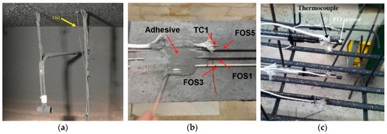 Application of FBG sensors in structural fire testing: (a) Gas temperature [11], (b) surface-attached on concrete beams [35], and (c) embedded in reinforced concrete beams [36].
