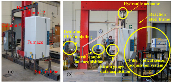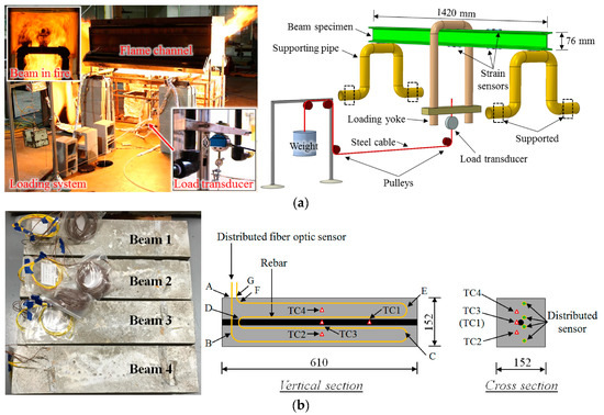 Application of long-period fiber gratings (LPFG) sensors in structural fire [56]: (a) Test set-up, and (b) instrumentation.