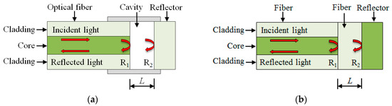 A number of techniques have been reported to form FPIs, such as thin film deposition [60,61], forming a micro-notch using femtosecond lasers [62], offset structures [63], chemical etching [64,65], and splicing [66]. Depending on the physical structure of an FPI, in-line FPIs can be categorized into extrinsic FPI (EFPI) and intrinsic FPI (IFPI). As illustrated in Figure 5, an EFPI has a cavity between the reflecting surfaces (R1 and R2), while an IFPI does not have the cavity.