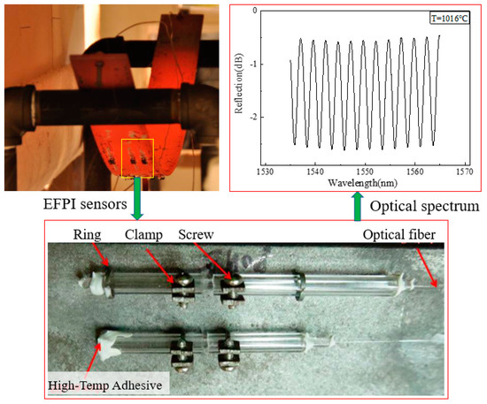 EFPI sensors have also been used to measure strain and crack opening in ceramic materials subjected to coal fire [68]. Crack opening widths in a range of 17 μm to 33 μm were measured using EFPI sensors at temperatures up to 900 °C. EFPI sensors with a similar scheme have been used to measure strains of steel frames [56]. The sensors attached on the surface of the steel columns measure large strains up to 10% at temperatures up to 800 °C.