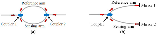 In-line CCMIs require a splitting and re-coupling mechanism between the core and cladding modes, which are guided by the core-cladding and cladding-ambient interfaces, respectively. The differential phase of the core and cladding modes allows CCMIs to sense numerous environmental parameters. CCMI sensors have been demonstrated to form MZIs and MIs, as illustrated in Figure 7a,b, respectively. Both structures involve a reference arm and a sensing arm. The main difference between MZIs and MIs is that an MZI requires two couplers, while an MI only needs one coupler that splits and re-combines the two beams due to the use of mirrors in the reference and sensing arms. MZI and MI sensors measure the transmitted signals and reflected signals, respectively.