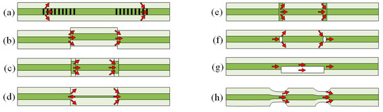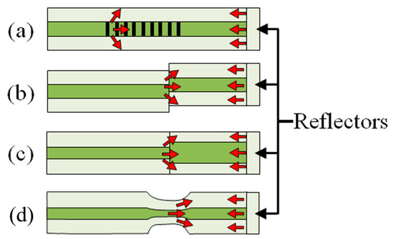 Based on the principle, different innovative strategies have been presented to realize the CCMIs. A pair of LPFGs can be used as the splitters/combiners to form an MZI, as illustrated in Figure 8a [76]. The operating temperature of the MZI is therefore limited by the temperature stability and other limitations of LPFGs aforementioned. Another method to couple the core mode to cladding modes is to splice two fibers with a small lateral offset, as depicted in Figure 8b. The number of coupled cladding modes can be controlled by adjusting the amount of offset. Using fibers with different core sizes is an alternative to split the beam in a fiber as shown in Figure 8c,d. In Figure 8c, a short multimode fiber is spliced to a conventional SMF at two points [77,78]. In Figure 8d, a length of fiber with a smaller core is spliced in between two conventional single mode fibers [79]. Collapsing air holes of a PCF is another way of making an in-line MZI, as shown in Figure 8e [80]. Cavities in the fiber can also be formed using a femtosecond laser as seen in Figure 8f,g to create the splitters/combiner pairs [81,82]. Finally, tapering of the fiber can also be used to create an MZI as shown in Figure 8h [83,84]. The tapering increases the core mode diameter.