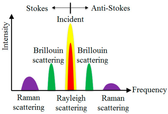 When light propagates through an optical fiber, it interacts with the atoms (or molecules) in the fiber, generating scattering signals that can be used to perform sensing [18]. There are three types of scattering: Rayleigh, Raman, and Brillouin scatterings, as illustrated in Figure 10. Rayleigh scattering results from the interaction between light waves and tiny particles inherent in the fiber. It is an elastic scattering process that does not involve a frequency change. Unlike Rayleigh scattering, Raman and Brillouin scattering involve frequency changes. Brillouin scattering is obtained by the interactions between light waves and acoustic waves, and Raman scattering is introduced by the interactions between light waves and molecular vibrations. Various distributed fiber optic sensing technologies have been developed based on these scattering phenomena [18]. When assessing the technologies for a particular application, one must consider tradeoffs between accuracy, spatial resolution, temporal resolution, and system cost.