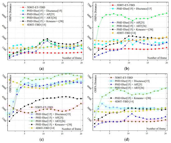 Ω represents the set of permutations of length m with elements taken from T. The cut-off value c and the distance order p of OSPA distance are set as c = 150 and p = 1 in this work. A smaller OSPA distance can be achieved when the extended targets can be well detected and merely a few false alarm trajectories arise. Figure 4 shows the OSPA distance of the six methods. Figure 4a corresponds to scenario 1, and so on. A smaller OSPA distance means a better tracking performance.