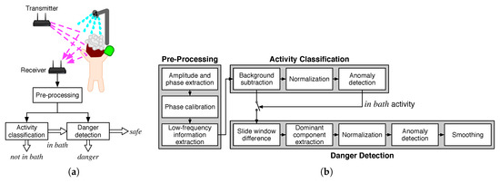 Figure 1 shows a system architecture of our danger pose detection system. As shown in Figure 1a, the danger-pose detection system consists of pre-processing, activity classification, and danger detection blocks as well as transmitter and receiver. We install transmitter and receiver in an NLOS environment, i.e., outside of a bathroom. Wi-Fi signals sent from the transmitter are reflected and diffracted by a monitoring target and reach the receiver. We extract CSI from the receiver, which are passed to the pre-processing block where calibration and denoising processes are performed to extract information related to human activities.