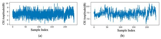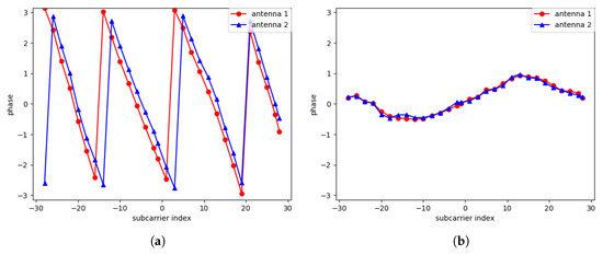 As for CSI extraction, we use the Linux 802.11n CSI Tool [24]. The CSI signal extracted by CSI Tool is stored in complex form. We can extract the amplitude and phase information on the original CSI as shown in Equation (1). Although IEEE 802.11n uses at least 64 subcarriers, we can derive CSI only for 30 subcarriers, which is a limitation of the CSI Tool we used.