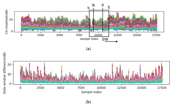 Example of slide windowing: (a) parameter and slide direction of slide window SW, and (b) calculated CSI difference in each slide window.
