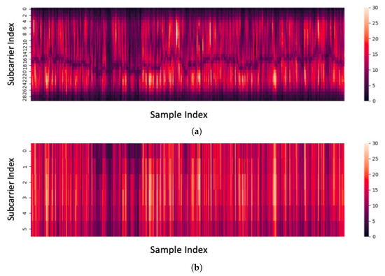 Figure 7 shows an example of the sensitive subcarrier extraction. Figure 7a shows amplitude, i.e., Frobenius norm, of all subcarriers and Figure 7b shows the extracted subcarriers (). As shown in the figure, the extracted subcarriers have relatively high amplitude values.