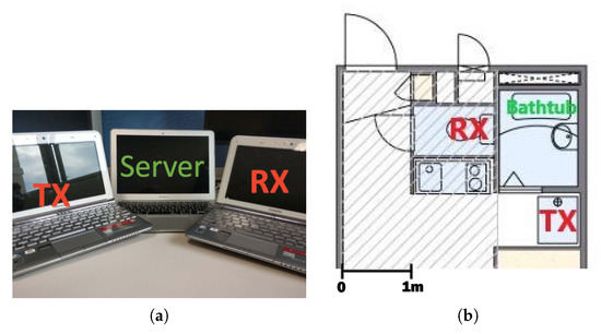Experiment setup: (a) transmitter (TX), receiver (RX), and server used in our experiment, and (b) configuration of TX, RX, and bathtub.