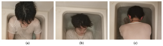 For the dangerous situation simulation, we assumed three dangerous situations as shown in Figure 9: (1) keep the lying position in a long time, (2) sink the whole body below the water surface, and (3) sink the face below the water surface. The danger-pose detection system is used to detect dangerous situations when taking a bath. Although target dangerous situations are not limited to the three simulated situations, we conducted evaluations with these three situations to demonstrate the basic performance of our system as an initial evaluation.