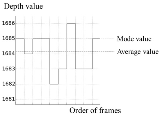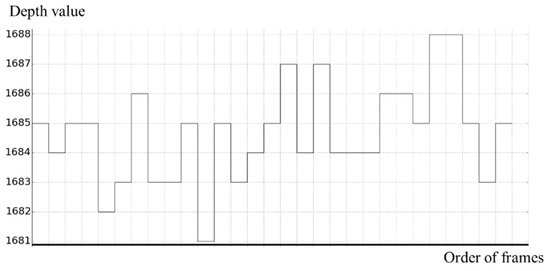 Noise in a depth picture occurs due to measurement errors of the depth camera device. This noise causes degrading performance in object feature detection in a depth picture. Figure 1 shows changes in depth values according to frame flow at a certain pixel. The depth values with errors are continuously measured, but an actual depth value is the most frequent. In addition, an average of the depth values is close to the actual depth value.