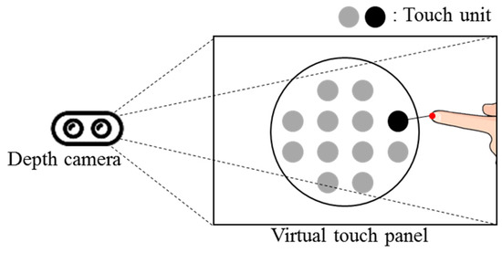 The proposed virtual touch sensor can only detect touch if a virtual touch panel is not changed, because touch detection uses the pre-stored depth values of the virtual touch panel. A step that modifies the pre-stored depth values if a virtual touch panel is changed can be introduced to detect touch on a dynamic virtual touch panel. However, updating changes to the stored depth values after obtaining the depth values of a changed virtual touch panel take a lot of time. In order to detect touch in a dynamic touch panel in real time, a method for the classification of a virtual touch panel and virtual touch objects without previously stored depth values needs to be studied further.