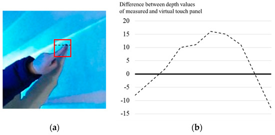 Difference between depth values of measured and virtual touch panel in position of touch: (a) original picture; (b) difference of depth values from virtual touch panel.