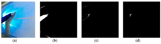 Touch region detection: (a) original picture; (b) touch object detection; (c) touch region detection with noise; (d) touch region detection without noise.