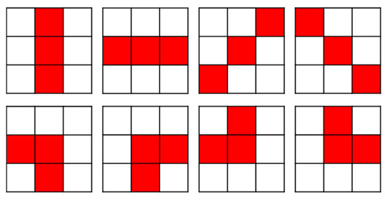 where Tt means a threshold for touch point detection. Pixels without accurate touch points may also be detected through Equation (2). In order to detect an accurate touch point, neighboring pixels should also satisfy Equation (2). If pixels satisfy Equation (2) at the position of the colored box in one of the 3 × 3 block patterns in Figure 7, a center pixel of the block is determined as a touch point.