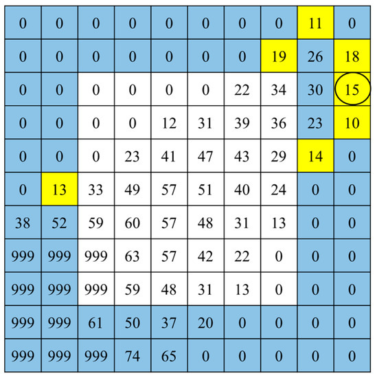 Figure 8 shows depth values in the bounding box of a touch region in Figure 6. Colored boxes are search areas and yellow boxes are pixels satisfying Equation (2) when Ds and Tt are set to 2 and 20, respectively. A circled pixel and neighboring pixels in a vertical direction satisfy Equation (2), so that this pixel is detected as a touch point.