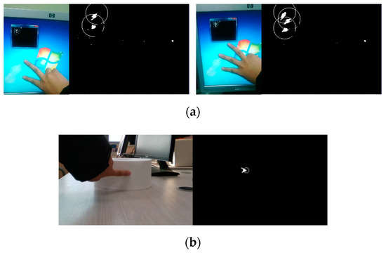 Currently, capacitive sensing methods [2,3,4,5,6,7] are the most used touch detection methods for touch interface. Capacitive sensing detects touch by measuring capacitances of electrodes. When an object such as a finger touches a panel that applies capacitive sensing, the amount of current that flows through electrodes mounted on the panel is changed. Capacitive sensing has the highest touch detection accuracy and speed among touch sensing methods. However, the price of a device using capacitive sensing increases as a panel size increases, since the touch interface device should be combined with the panel. Instead of the capacitive sensing method, methods using an infrared sensor [8,9,10] and an ultrasonic sensor [11,12,13] can be used to detect touch on a large screen. In the touch detection methods using infrared sensors, infrared emitter sensors attached to the screen emit infrared rays and then infrared detection sensors on the opposite side detect the infrared rays. When touch occurs, a touch object blocks the infrared rays, so the infrared detection sensors cannot detect the infrared rays. Touch detection methods using ultrasonic sensors are similar to the methods using infrared sensors. The touch detection methods using infrared or ultrasonic sensors have a limitation as the shape of the screen has to be flat.