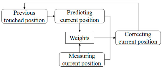 A proposed filter for correcting touch path errors is similar to the Kalman filter that corrects a measured state through a prediction step, but it introduces a weight parameter in order to respond quickly even with sudden changes. The weight parameter is related to a difference between the predicted and measured positions of a touch point. Figure 11 shows the proposed filter.