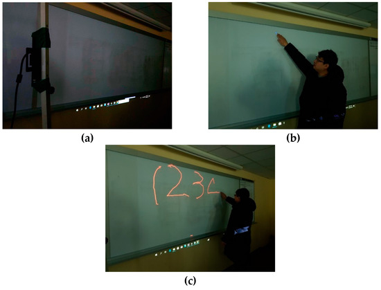 Implementation of touch-pen using virtual touch sensor: (a) placing depth camera; (b) calibration of virtual touch sensor; (c) implementation of touch-pen.