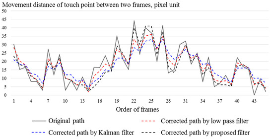 Average angle errors of the original path, corrected paths by low-pass filter, Kalman filter, and proposed filter are 12.688°, 10.792°, 6.937°, and 6.813°, respectively. Figure 17 shows the results of correcting the touch path.