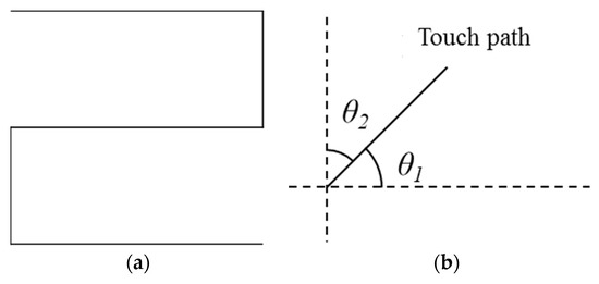 We drew a shape as shown in Figure 16a, consisting of repetitive vertical and horizontal lines by using the touch-pen interface. Then we measured angles θ1, θ2 as shown in Figure 16b, between horizontal and vertical axes from a drawn line, respectively. A smaller angle is selected from two angles. A selected angle can be considered as an amount of touch path error. The angle errors converge to 0 as the path correction is accurate.