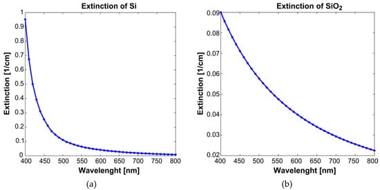 where and are two parameters with normalized values between 0 and 1, which represent the concentrations of Si and SiO2 in the evaporated wafer. The components and are the extinction coefficients of Si and SiO2, as presented in Figure 1a,b, respectively [,].