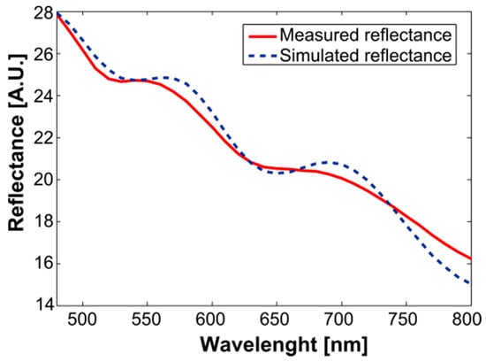 - Then, with the current value of the model’s variables, a simulated diffuse reflectance spectrum () was calculated by means of Equation (3).