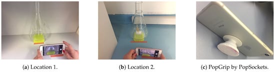 Images are acquired at two locations in the laboratory with different backgrounds, one which is white and provides a rather bad contrast (Figure 2a) and another which is blue and provides a rather good contrast (Figure 2b), as this colour is not expected to be much expressed elsewhere in the images. In addition, the light conditions are different, location 1 (tabletop) is rather unshielded and, thus, arguably more sensible to changes in light than location 2 that constitutes the floor under the bench. We use two different smartphones, iPhone 7 and iPhone 6S by Apple Inc. for location 1 and location 2, respectively. Both are equipped with a 12 MP camera with High Dynamic Range (HDR), where the former one provides images of size pixels, while the latter provides ones of size pixels, which we consider to be qualitatively equivalent for the purpose of the paper. After incubation, four images are acquired in quick order every 30 min. Notably, we take care for the focus to be right, and images are always acquired from nearly the same distance, and the smartphones are held steadily at nearly the same angle, for which we appreciate the help of a PopGrip from PopSockets (Boulder, Colorado, USA) (Figure 2c). Nevertheless, images still quite differ as shown in Figure 3, which highlights the challenges for an image-segmentation procedure and for a method that uses changes in a medium colour to predict changes in OD.