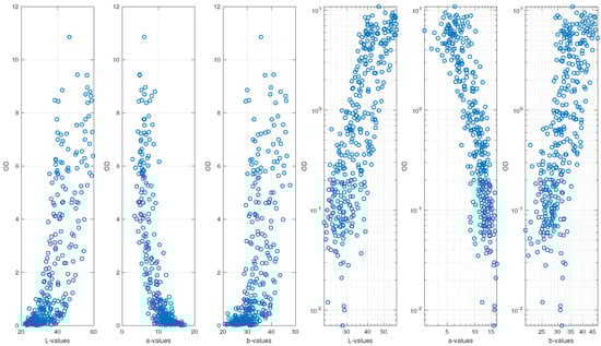 Let us denote the set of all measurement by whose elements are given by tuples of the form . To predict the OD value of the i-th measurement, which is , from the values of the CIELAB colour components, we use multi-variate linear regression models of the following form: