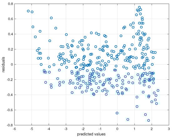 Assuming a linear relationship between log-transformed values of OD and log-transformed values of the colour space that is expressed through a model of the form given by Equation (2), we obtain predictions for OD-values using the cross-validation scheme described in Section 2.5.5. Visual inspection of Figure 7, the plot of residuals versus predicted values, seems to reveal slight violation of linearity and homoscedasticity. However, the Kolmogorov–Smirnov test did not reject the assumption that residuals are normally distributed.