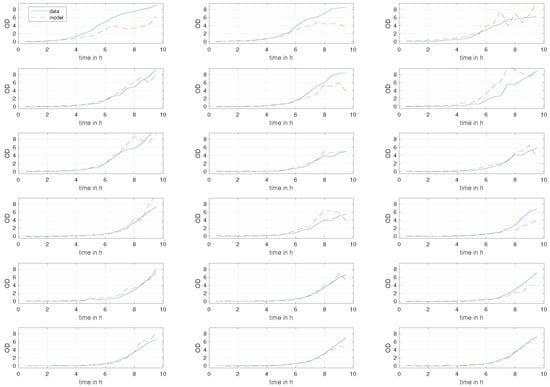 Figure 6 shows the relationship between OD and colour components of all experiments. The three panels to the left show data as is, and the right ones show data, where all values have been log-transformed, which is in Equation (2), where we omitted the first measurement of each experiment, as for timepoint h, the OD value is zero and, thus, cannot be log-transformed. Clearly, the three panels on the righthand side rather depict a linear relationship between dependent and independent variables. Thus, we consider a linear relationship between log-transformed values of OD and log-transformed values of the colour space for the regression model. For the reminder of the paper and all experiments, we consider the measurement at timepoint t = 0.5 h to be the first measurement.