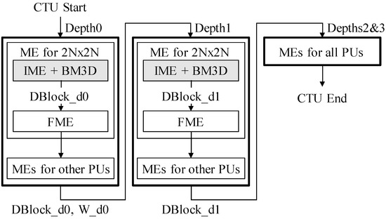 Figure 1 shows the overall flow of the proposed algorithm. In the gray shaded areas, the HEVC and simplified BM3D (sBM3D) algorithms are combined. sBM3D covers step 1 of BM3D. First, sBM3D is performed on the block patches obtained from the IME for the 2N × 2N PU of Depth0. Denoised DBlock_d0 replaces the noisy input block, and FME of 2N × 2N PU is performed. Then, other PU types also use DBlock_d0. Intra-prediction is excluded from the figure for simplicity. When proceeding to Depth1, DBlock_d0 and the corresponding weight W_d0 are transmitted. The weight is determined by the number of coefficients that are the result of collaborative filtering. The larger the number of coefficients, the greater the weight, because there is a lot video information remaining. In Depth1, sBM3D is performed after the IME of 2N × 2N PU in a manner similar to that used with Depth0. At this time, DBlock_d0 from Depth0 is added to the group. At this point, DBlock_d1 is generated after aggregation using W_d0 and W_d1. Depth2 and Depth3 perform all the predictions using recently denoised input blocks, DBlock_d1. There is no restriction on the block size. If the CU size is 8 × 8, the minimum unit of the inter block grouping can be performed. However, the advantage of depth hierarchy is not available. The proposed schemes are described in detail in the following sections.