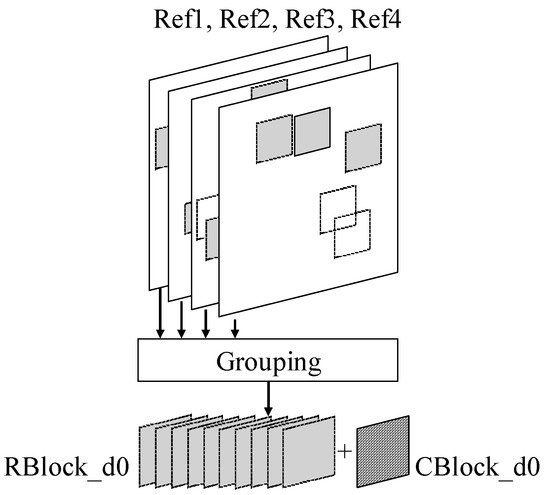 Figure 2 shows the grouping process of sBM3D for a noisy 2N × 2N PU block in Depth0 using the IME results. In the ME of HEVC, block matching is performed only in the reference frame and not in the current frame. Nevertheless, it is possible to obtain an adequate number of similar block patches from the neighboring frames given that there is high temporal correlation between the frames. The noisy current block of Depth0 is denoted by CBlock_d0. IME is performed on the reference frames, Ref1, Ref2, Ref3, and Ref4, and then, grouping is performed with blocks having a sum of absolute difference (SAD) value smaller than THgroup among the searched blocks. This group is denoted by RBlock_d0. CBlock_d0 is also added to the group RBlock_d0. THgroup is set to 1.2 times the value of minSAD, which is the smallest SAD value of the searched blocks. If only the blocks with minSAD are chosen, there will only be a small number of blocks to group. Blocks with a SAD value of 1.2 times the minSAD are determined to be sufficiently similar experimentally. Therefore, the selection of blocks corresponding to minSAD × 1.2 enables a sufficient group size. The CU size of HEVC varies from 64 × 64 to 8 × 8. If sBM3D is always performed with a size of 2N × 2N PU, it will be difficult to denoise precisely when the block size is large (e.g., 64 × 64). Therefore, RBlock_d0 and CBlock_d0 are divided into 8 × 8-sized units. Transforming and filtering (TF) processes are then conducted in the 8 × 8 units [30].