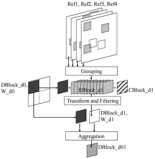 From Depth1, the hierarchical ME processing of HEVC is actively utilized. Figure 3 shows the sBM3D in a CU of Depth1. The noisy current 2N × 2N PU is denoted by CBlock_d1. RBlock_d1 values for CBlock_d1 are obtained from the reference frames using the scheme introduced in Section 2.2. CBlock_d1 and RBlock_d1 are grouped. The area corresponding to CBlock_d1 is extracted from DBlock_d0 and then added to the group. After performing TF, this group has a weight of W_d1. Next, aggregation is performed using W_d0, which is the weight from the upper depth. Thus, sBM3D at multiple depths can overcome some of the limitations of non-overlapping block matching. Several overlapping patch blocks naturally allow aggregation. In addition, a good block patch can be obtained by also including the denoised blocks of the upper depth in a group at a lower depth. Hence, effects similar to those in step 2 of BM3D can be expected. In this paper, sBM3D was performed only for Depth0 and Depth1. When sBM3D is performed for all depth CUs, the computational complexity increases sharply, whereas the additional denoising effect is insignificant.