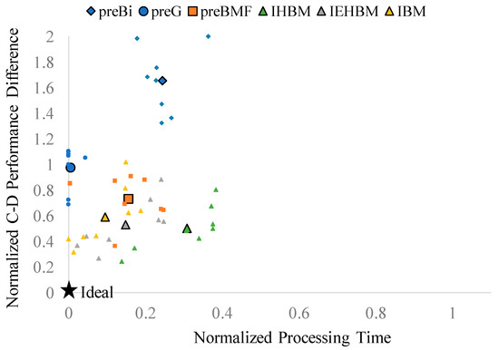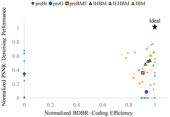 Figure 5 shows the compression–denoising–time (C-D-T) performance outcomes for each algorithm for sigma = 15 in the LD condition. The horizontal axis represents the processing time, which was normalized from Table 3. The vertical axis represents the difference in the C-D performance compared with preBM. The coordinates of the ideal point are (0, 0). When the horizontal axis is 0, the processing time becomes smaller than the preBM located at the horizontal axis = 1, and thereby, the computational complexity is reduced. On the vertical axis, which indicates the difference in performance from preBM, the C-D performance is excellent when the coordinate value is close to zero. How close the C-D performance of the algorithms is to that of preBM is measured by calculating the Manhattan distance between the coordinates of each algorithm and the (1, 1) position of preBM in Figure 4. The algorithm located at the bottom left of the coordinate space has the best C-D-T performance. preBi and preG are located at the top of the coordinate space due to their low C-D performances. IHBM, denoted with the green triangle, shows a somewhat longer processing time. IEHBM, denoted by the gray triangle, shows the best results on average when considering both the C-D performance and the processing time.