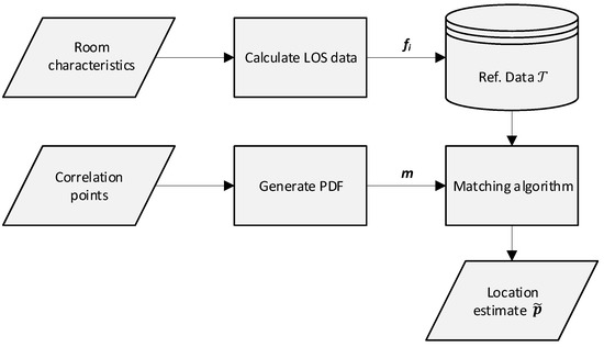 where Q denotes the number of nodes. The grid point with the highest value in is selected as the estimated location , resulting in a set of x- and y-coordinates. The flowchart in Figure 2 summarizes the operation of the localization solution.