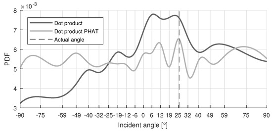 Figure 5 visualizes the PDF, with an incident angle of 26, for the dot product and dot product PHAT correlation methods. In this figure the main difference between the two methods can be observed: the PHAT method generates sharper peaks, but for the depicted incident angle the intensity of the direct wave is less pronounced than the other peaks in the PDF. The x-axis also shows the angular distribution of the calculated correlation points. This is caused by the sine term in Equation (1). The density of correlation points decreases with increasing incident angle, resulting in larger errors when the incident angle increases.