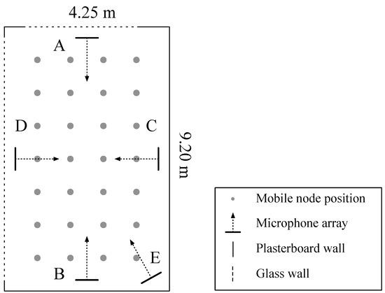 To test the accuracy of the two algorithms, five sensor nodes (A, B, C, D and E), containing the previously discussed hardware, were deployed in an empty rectangular meeting room. Figure 6 depicts the setup, being m wide, m long and m high. Most of the walls are made of plasterboard, while the wall behind A and D contains single sided glass. Table 2 summarizes the RT60 reverberation time of the room, measured with an NTI XL2 acoustic analyzer with M2211 measurement microphone. Arrays A, B, C and D are positioned parallel to and in the middle of each wall, at a distance of 19 cm from that wall and at height of m. Array E is positioned perpendicular to the room diagonal at the same height. An equally distributed grid of 28 positions (gray dots in Figure 6) was used for test measurements. Each position was evaluated by playing two sound samples with a different bandwidth, namely white Gaussian noise and female spoken Harvard sentences [28]. The white Gaussian noise signal had a bandwidth of 48 kHz, while the audio file of the female spoken sentences only had a bandwidth of kHz. The sound events were played through a dodecahedron omnidirectional speaker at a height of m. The speaker produces a spherical acoustic wave, excluding directional effects of the localized sound source. The matching algorithm started from a reference set consisting of 42 points along the width and 92 points along the length of the room, resulting in an equally distributed grid of 3864 points for each node. The reference dataset was precalculated during the setup phase of the localization system, requiring 13 s of processing time for each sensor node in the system. The data were generated using a Matlab script, running on machine with an Intel Core i7-2600 processor. After an acoustic event, the recorded data were received and processed by another Matlab script generating the SPDF for each sensor node. It took s to compute the SPDF of each sensor node, but this could be reduced significantly by using optimized compiled code.