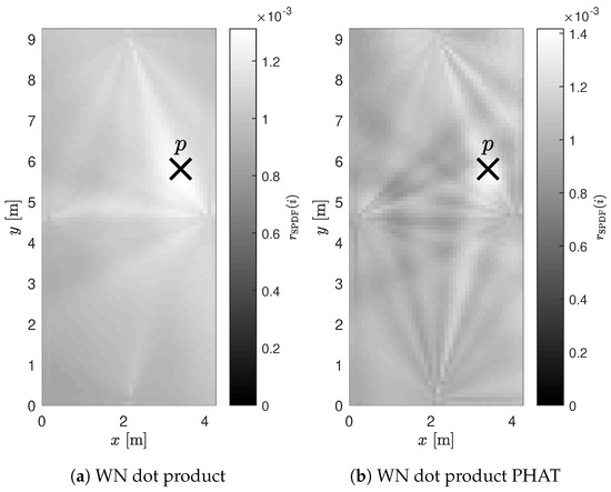 Figure 7 visualizes two merged SPDF maps for four nodes placed in the center of each wall. The first SPDF was generated for the dot product method, while the second one used the dot product PHAT method. A light color in the figure means a high location probability.