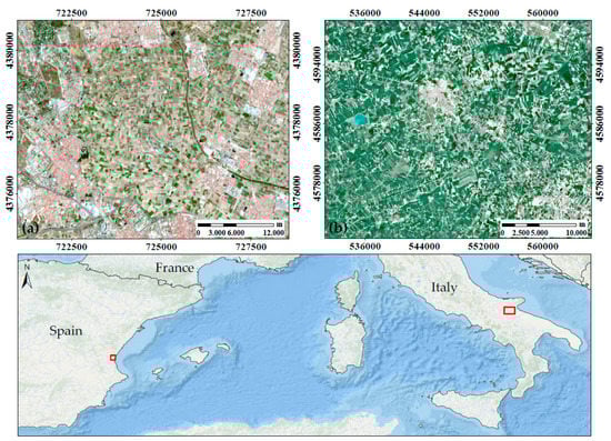 Test site locations. (a) Valencia (Spain) from the Sentinel-2 image of 6 April 2017, UTM-WGS84 Zone 30S (b) Foggia (Italy) from the Sentinel-2 image of 8 April 2017, UTM-WGS84 Zone 33T.