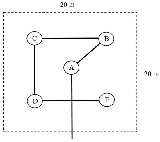 At each study site, a large LAIgreen dataset was collected with the LAI-2200 Plant Canopy Analyzer [], which uses a fish-eyes lens with a hemispheric field of view (±45°). The detector is composed of five concentric rings (sensitive to radiation below 490 nm). Each ring responds over a different range of zenith angles and radiation is, thus, azimuthally integrated. The measurements were collected in one sensor mode using a 180° view cap, in clear sky condition, to avoid interferences from a user’s shadow, following the Land European Remote-Sensing Instruments (VALERI) field protocol (http://w3.avignon.inra.fr/valeri/). The VALERI protocol is a sampling strategy corresponding to high spatial-resolution satellite imagery, choosing elementary sampling units (ESUs) of 20 m × 20 m for each measuring plot. Each ESU was chosen in the middle of the crop field which had minimum dimensions of 40 m × 40 m in Valencia and 100 m × 100 m in Foggia. A minimum distance of 20 m from the edges of the field was kept. To account for the spatial LAIgreen variability within each ESU, measuring points were sampled following a square spatial sampling with 5 measurements at each point (A, B, C, D and E), providing a statistically mean LAIgreen estimate per ESU (Figure 2). The centre of the ESU (sampling point A) was geo-located using a GPS providing an accuracy of less than 5 m for later matching the mean LAIgreen estimate with the corresponding Sentinel-2 reflectance data. The field protocol was identic for both study sites.